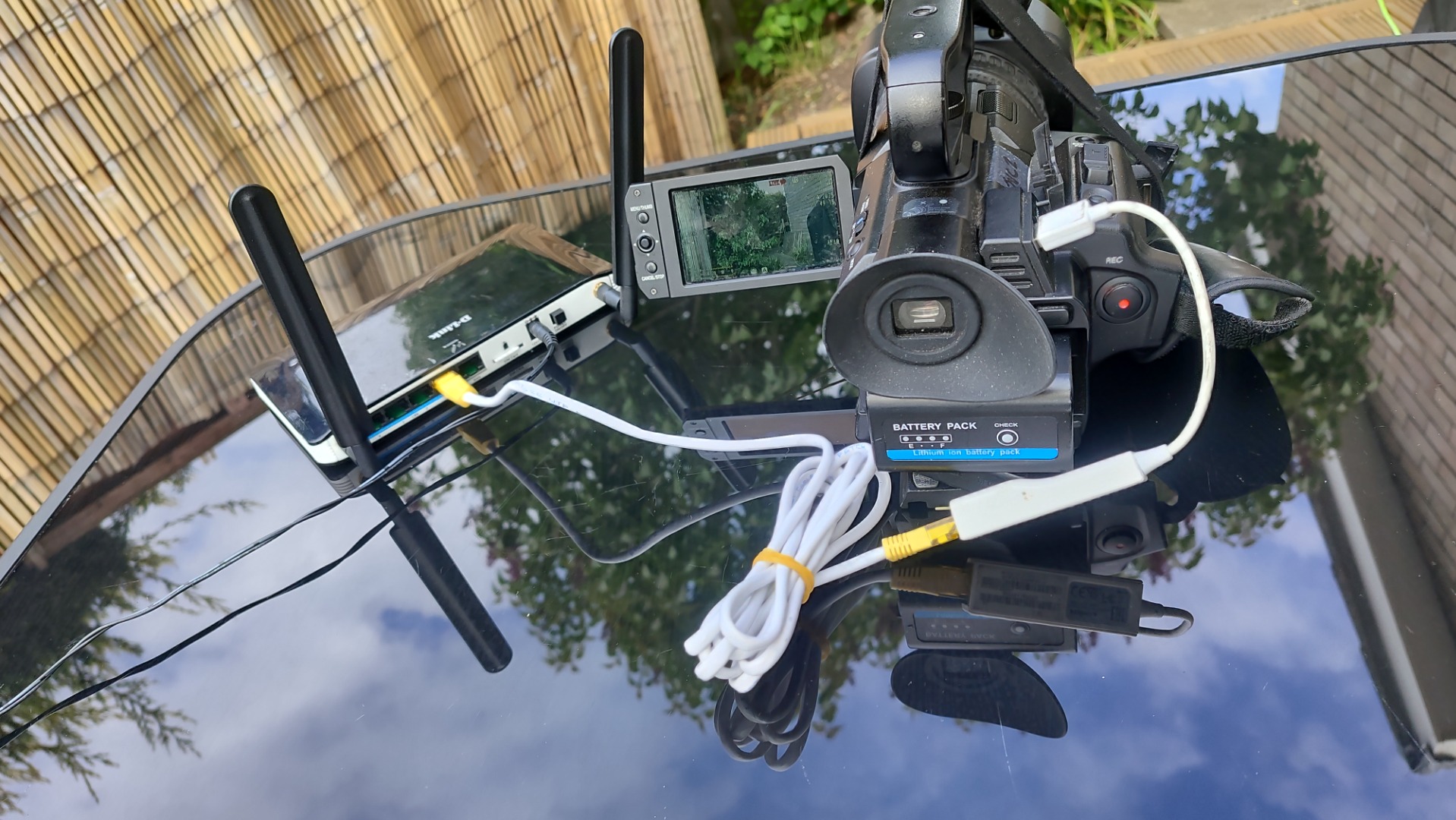 The setup below shows the JVC camera with LAN cable connected to a router with SIM card. This gives direct connectivity but relies in a good data connection.